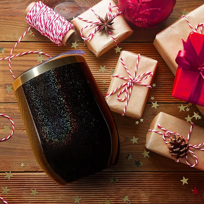 MEWAY 12oz/12 Pack Wine Tumbler Glasses with Lid - Stemless Double Wall Vacuum Stainless Steel Glitter Tumbler - Keeping Cold & Hot Cup for Coffee,Gift for Women(Rainbow Black,Set of 12)