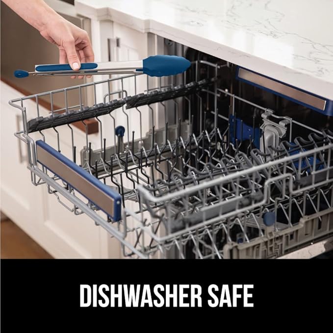 GORILLA GRIP Stainless Steel Heat Resistant Kitchen Tongs for Cooking, Set of 2 BBQ Tong, Non Scratch Silicone Tip for Pans, Strong Grip, Grab Food, Toss Salad, Air Fryer, Pull Lock, 7 + 9 Inch, Blue