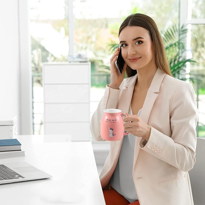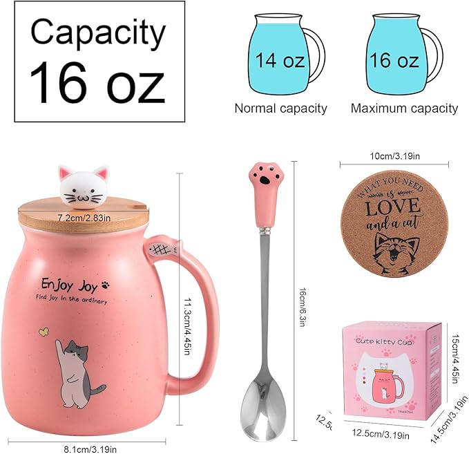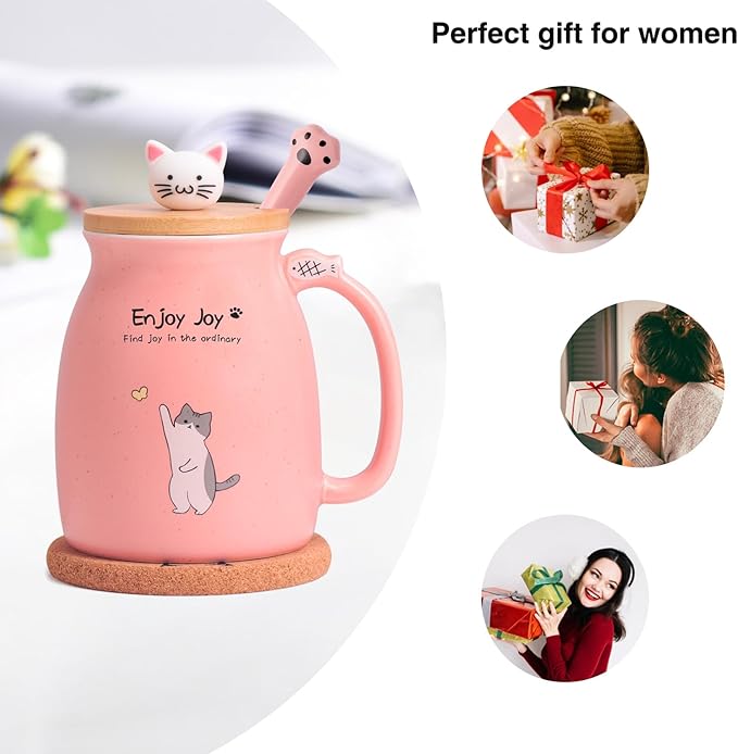 Cute Cat Cup Ceramic Coffee Mug with Kawaii Cat Wooden Lid, Lovely Stainless Steel Spoon, Anime Kitty Thicken Wooden Coaster, Christmas Birthday Cute Thing Japanese Mug 16oz (Pink)