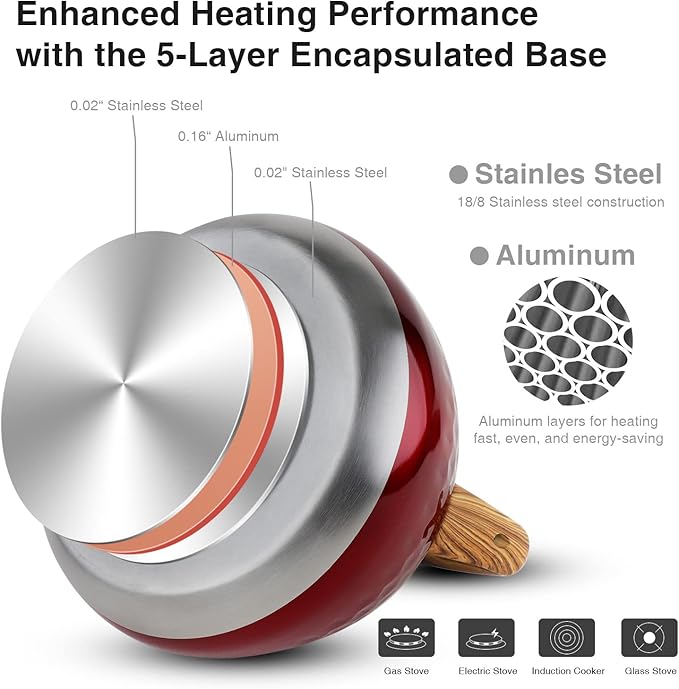 Tea Kettle, Toptier Teapot Whistling Kettle with Wood Pattern Handle Loud Whistle, Food Grade Stainless Steel Tea Pot for Stovetops Induction Diamond Design Water Kettle, 2.7-Quart Red