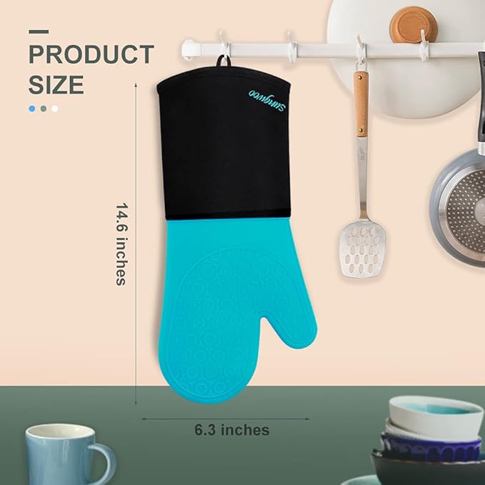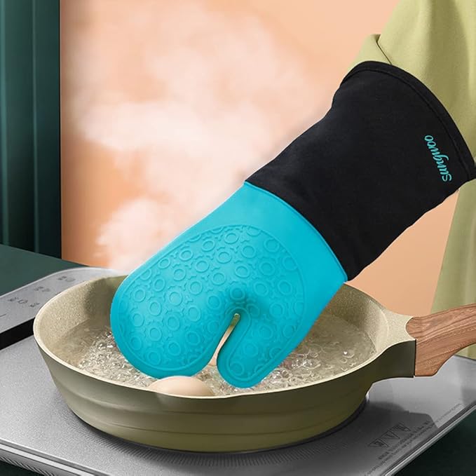 sungwoo Extra Long Silicone Oven Mitts, Heat Resistant Oven Gloves with Quilted Liner Non-Slip Textured Grip Perfect for BBQ, Baking, Cooking and Grilling - 1 Pair 14.6 Inch Turquoise & Black