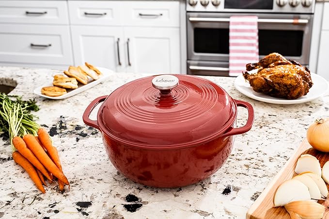 Lodge 6 Quart Enameled Cast Iron Dutch Oven with Lid – Dual Handles – Oven Safe up to 500° F or on Stovetop - Use to Marinate, Cook, Bake, Refrigerate and Serve – Cranberry