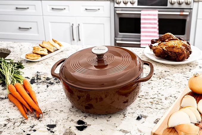 Lodge 6 Quart Enameled Cast Iron Dutch Oven with Lid – Dual Handles – Oven Safe up to 500° F or on Stovetop - Use to Marinate, Cook, Bake, Refrigerate and Serve – Burnt Sienna