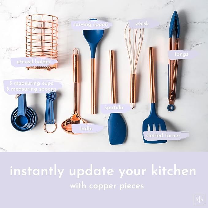 Copper and Blue Silicone Cooking Utensils Set - 17-Piece Set with Copper Utensil Holder and Measuring Cups and Spoons for Stylish Cooking and Baking - Blue Kitchen Decor, Unique Kitchen Gifts