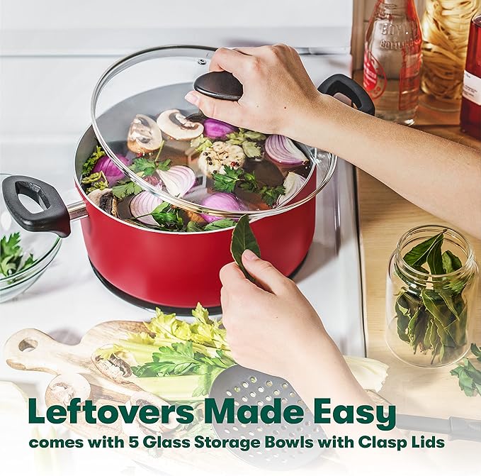 BELLA Cookware Set, 12 Piece Pots and Pans with Utensils, Nonstick PFOA Free Scratch Resistant Cooking Surface Compatible with All Stoves, Nylon and Aluminum, Red