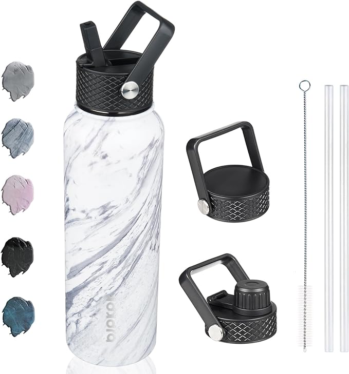 BJPKPK Insulated Water Bottles with Straw Lid, 40oz Stainless Steel Water Bottles with 3 Lids, BPA Free Leakproof Thermo, Tumblers, Cups for Sports, Gym- Marble Frozen