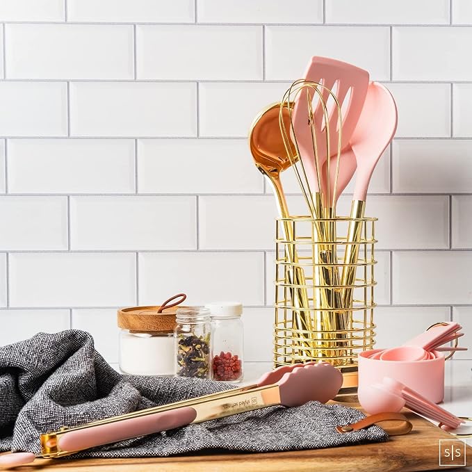 About This ✔ PRETTY IN PINK 17 PIECE SILICONE COOKING UTENSIL SET WITH MATCHING GOLD UTENSIL HOLDER — complement pink... Read more