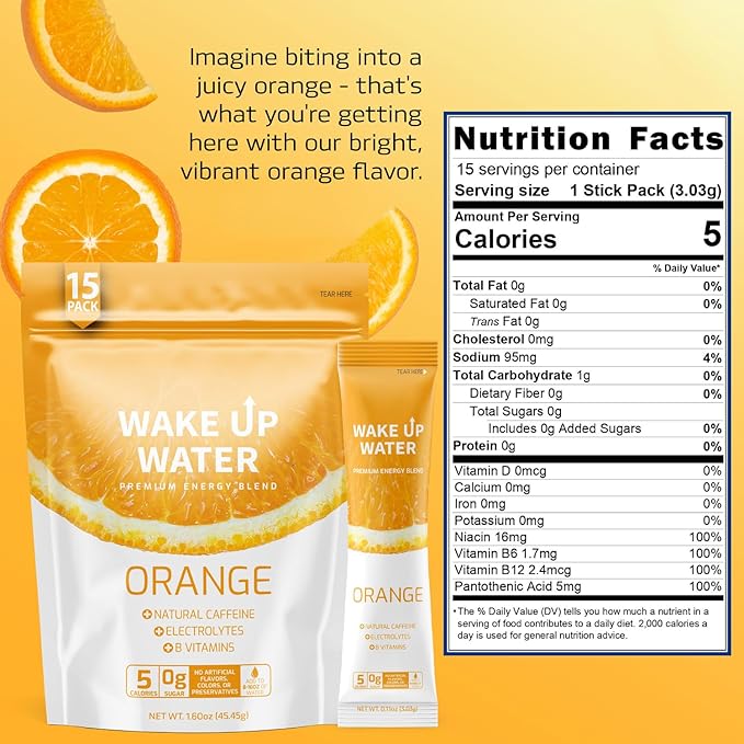 Wake Up Water - Energy + Hydration Sugar Free 15 Packs, Orange Flavor - Energy Drink Powder, Electrolytes Powder Drink, Natural Caffeine Mix Packet, B Vitamins, 5 Calories, Gluten Free - 1.60 oz (45.45g)