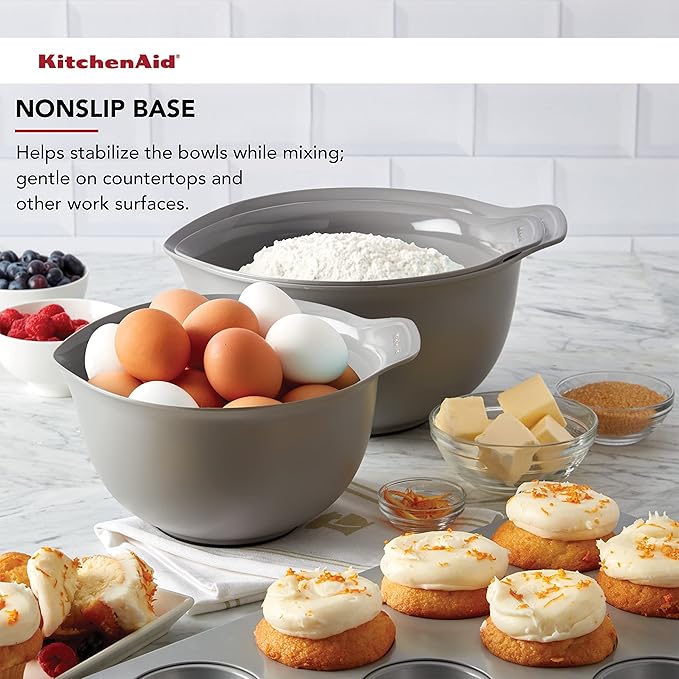 KitchenAid Universal Nesting Plastic Mixing Bowls, Set Of 3, 2.5 quart, 3.5 quart, 4.5 quart, Non Slip Base with Easy Pour Spout to Reduce Mess, Dishwasher Safe, Gray