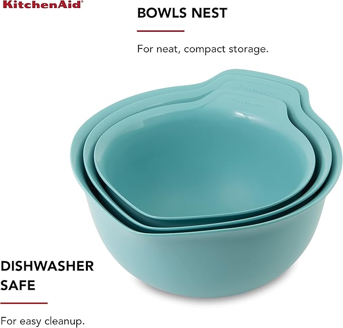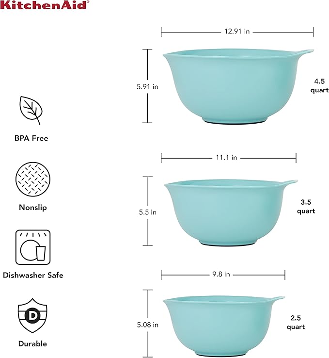 KitchenAid Universal Nesting Plastic Mixing Bowls with Non Slip Base and Pour Spout, Dishwasher Safe, Set Of 3, 2.5 quart, 3.5 quart and 4.5 quart, Aqua Sky