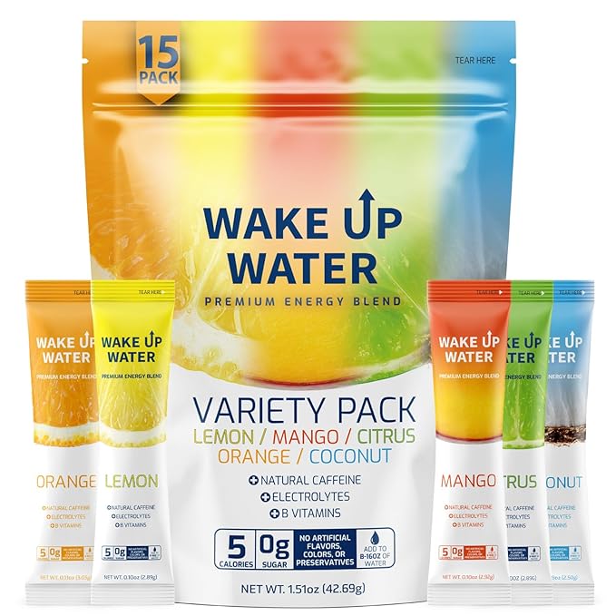 Wake Up Water Energy Drink Mix, Sugar Free Clean Energy Powder with Electrolytes & B Vitamins, Natural Caffeine for Focus & Hydration (15 Pack) - Variety