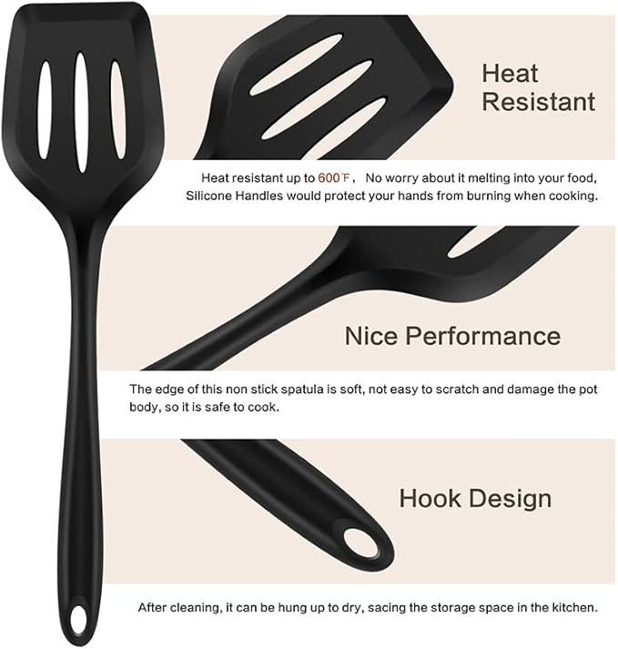 Silicone Spatula Turner Set, 2PCS Heat-Resistant Non-Stick Fish Slotted Spatula Kitchen Utensil Set for Cooking, Baking and Mixing, BPA Free & Dishwasher Safe (Black)