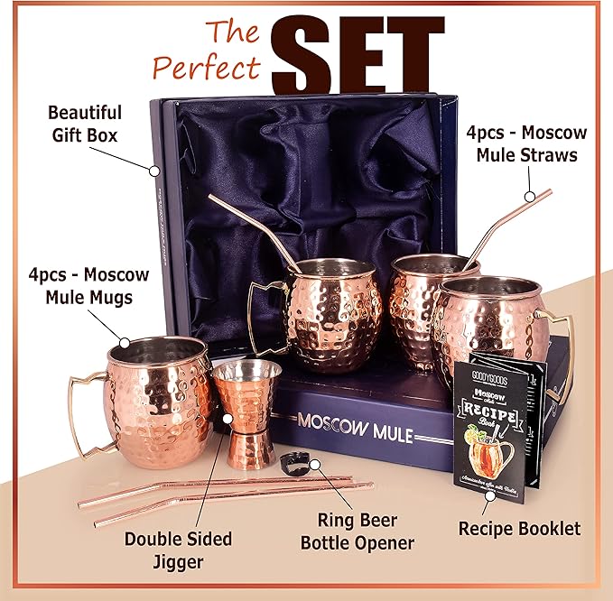 G GOODYGOODS Moscow Mule Mugs, Real Copper Plating, Stainless Steel inside Lining, Gift Set of 4 Handcrafted 18 Oz Copper Cups, 4 Unique Straws, Jigger, Ring Bottle Opener & Recipe Booklet!