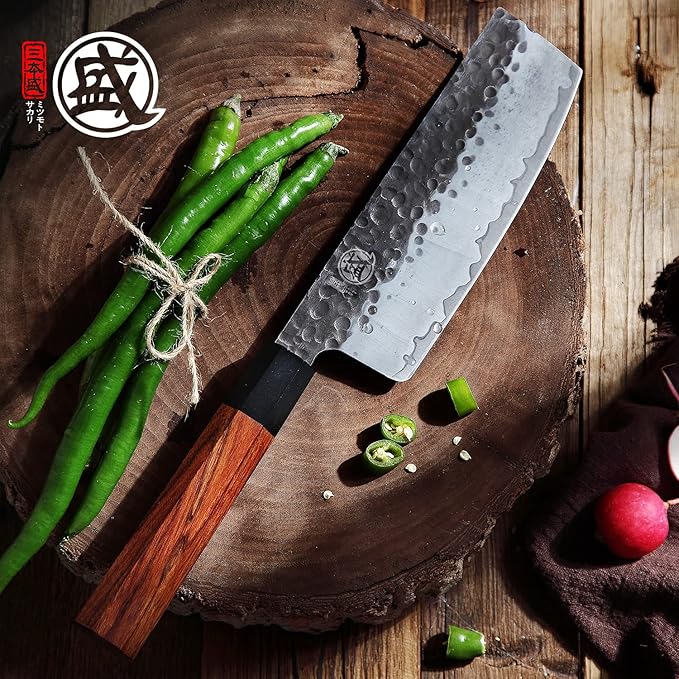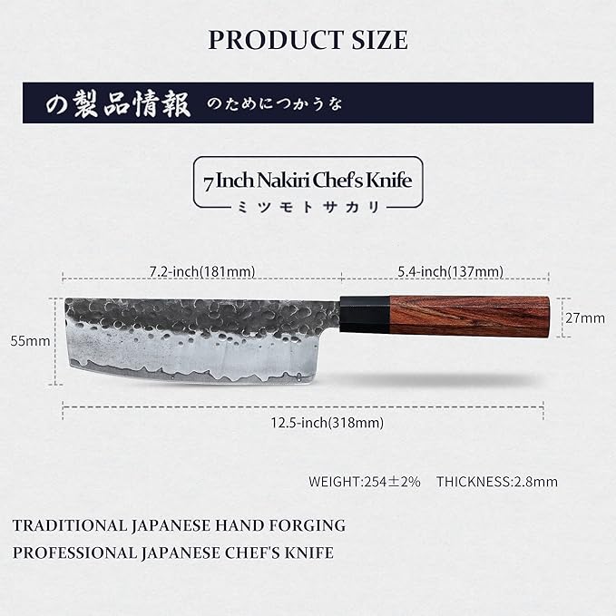 MITSUMOTO SAKARI Nakiri Chef Knife 7 inch - Hand Forged Japanese Kitchen Knives, 3-Layer 9CR18MOV High Carbon Steel, Rosewood Handle & Sandalwood Box