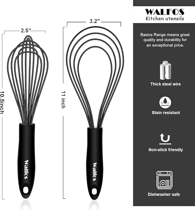 Walfos Whisk 11inch Flat Whisks and 10inch Balloon Whisk Combo,Silicone whisks for cooking,Non Scratch Coated Wisk,Suitable for Ceramic Coated pans and Wider shallower pots.(2pcs black)