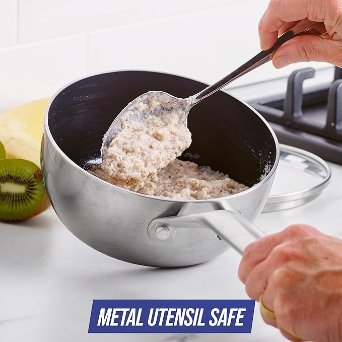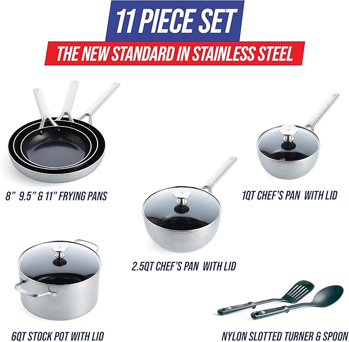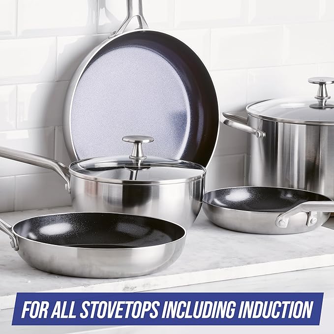 Blue Diamond 11 Piece Cookware Set, Stainless Steel Tri-Ply, Induction Compatible, Diamond Infused Ceramic Nonstick, PFOA and PFAS Free, Dishwasher Safe, Metal Utensil Safe, Scratch Resistant, Silver