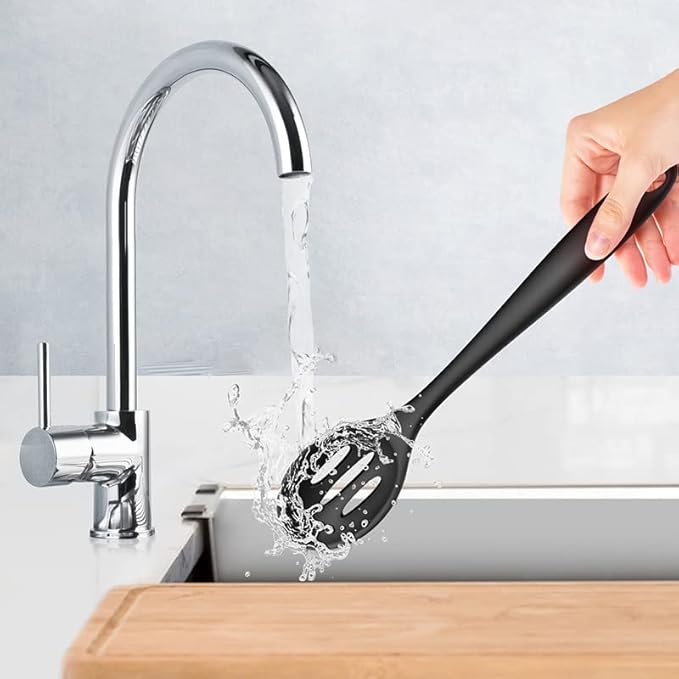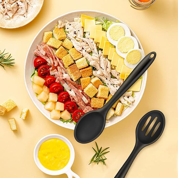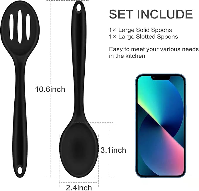 2PCS Silicone Nonstick Spoons, Heat Resistant, BPA Free, Ergonomic, Long Handle, Wide Bowl, Black