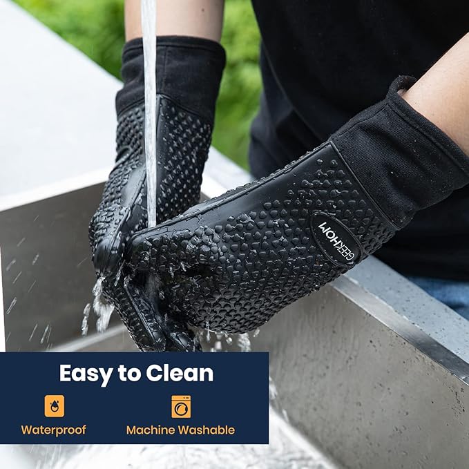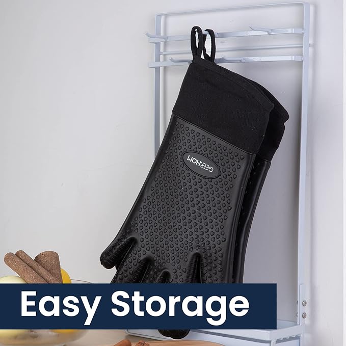 GEEKHOM BBQ Gloves X-Large, Heat Resistant Kitchen Silicone Oven Mitts, Waterproof Oven Gloves, BBQ Grill Accessories for Baking, Fryer, Smoker, Weber, Pizza, Microwave, Non-Slip, Black