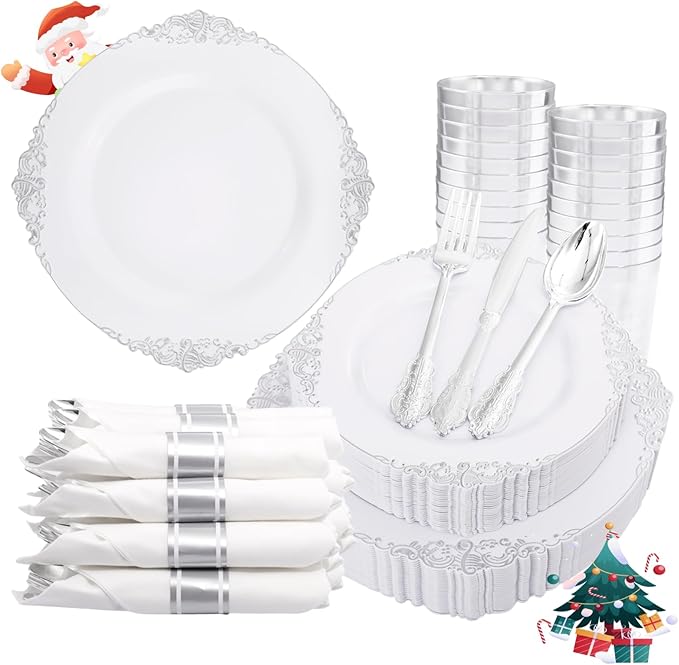 Liacere 350PCS Silver Plastic Plates&Pre Rolled Napkins for 50 Guests - Plastic Dinnerware Sets 100Silver Disposable Plates, 150Silver Silverware, 50Cups and 50Napkins for Christmas