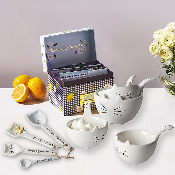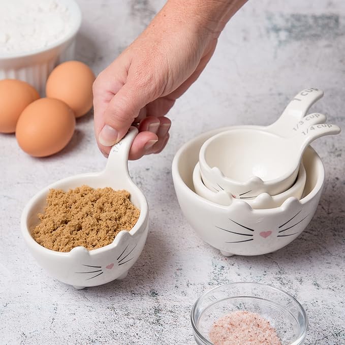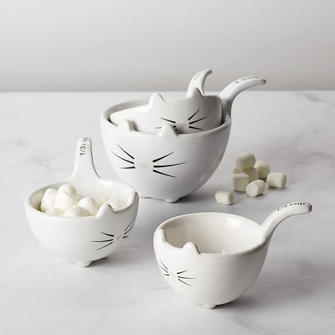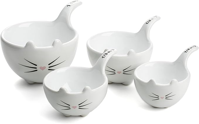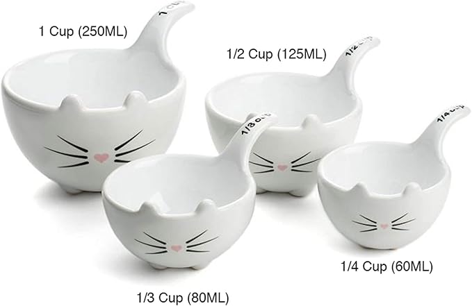 White Ceramic Cat Measuring Cups: Set of Cat Shaped Bowls - 1 Cup, 1/2 Cup, 1/3 Cup and 1/4 Cup