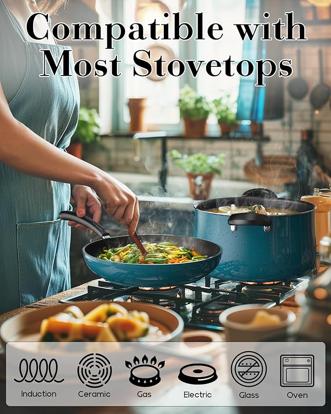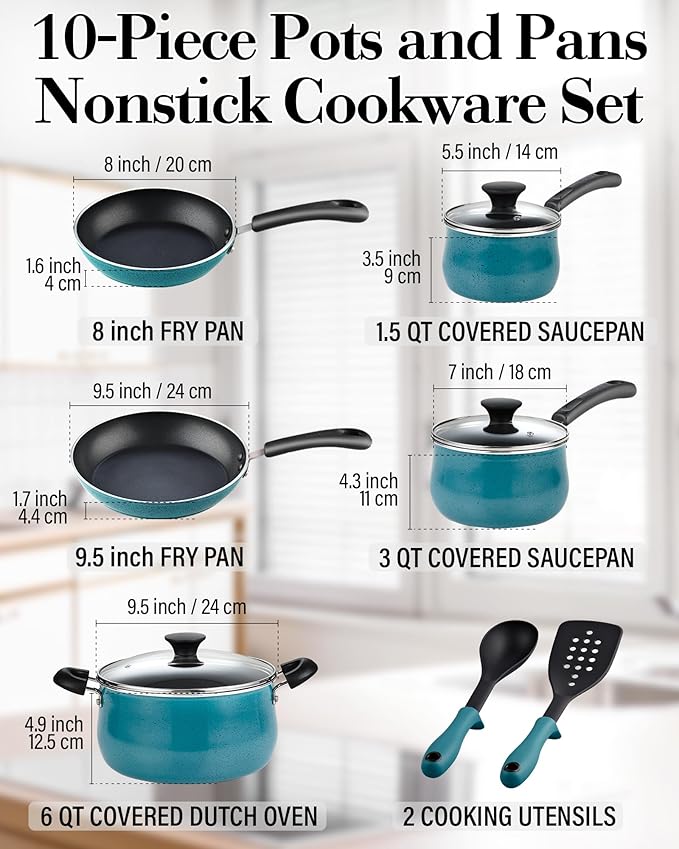 Cook N Home Pots and Pans Nonstick Cookware Set 10-Piece, Belly Shape Kitchen Cooking Set with Frying Pans and Saucepans, Induction Compatible, Turquoise