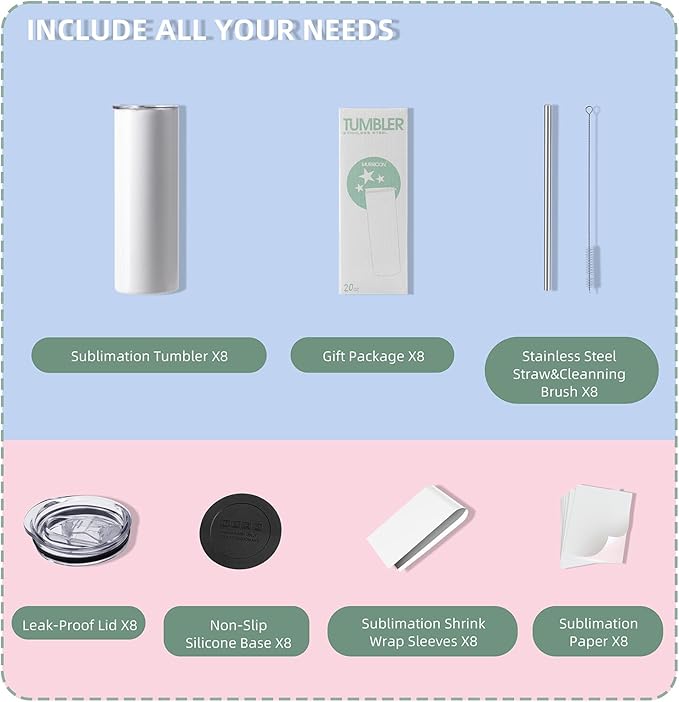 MURRICON Sublimation Tumblers 20 oz Skinny Straight,Stainless Steel Sublimation Blanks Skinny Tumbler,Double Wall Vacuum Insulated Tumblers,with lid and straw,8 Pack