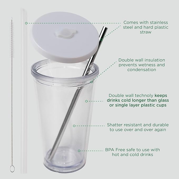 Reusable Iced Coffee Cup (24 Oz/Venti), Leak Proof and Double Wall Insulated Iced Coffee Tumbler, Come with Reusable Plastic and Metal Straws and Straw Cleaner - White