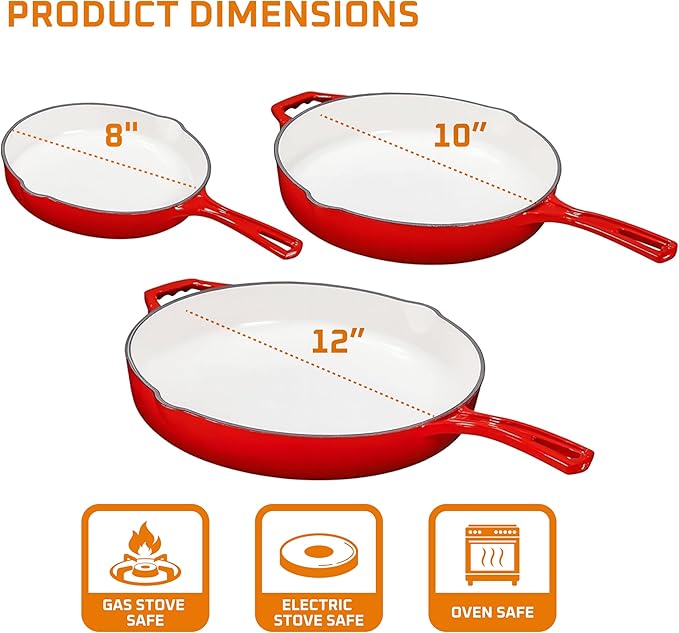 Bruntmor Set of 3 Enameled Cast Iron Skillets - Includes 8, 10, and 12 Inch Cast Iron Pan with Ceramic Nonstick Coating and Tempered Glass Lid - Durable Cookware for Frying, Baking, and Grilling - Red