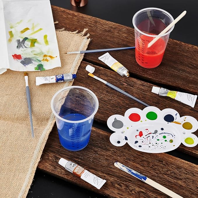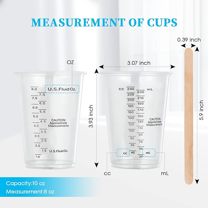 100 PACK Plastic Measuring Cups, 10 oz Disposable Mixing Cups with 100 Wooden Mixing Sticks, Can Be Used for Epoxy Resin, Liquid Measuring, Paint, Cooking and Baking