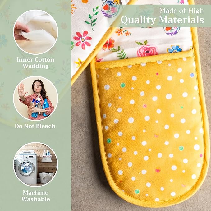 Maison d' Hermine Double Oven Mitts 100% Cotton 7"x35" Double Oven Mitt Heat Resistant BBQ Cooking Gloves with Loop, Baking, Grilling, Kitchen, Handling Hot Pans Spring Summer (Happy Florals - Sweety)