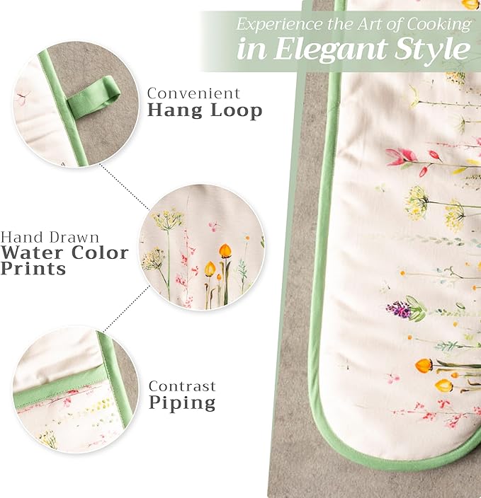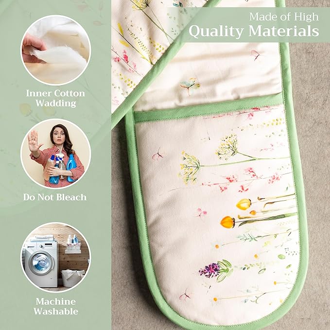 Maison d' Hermine Double Oven Mitts 100% Cotton 7"x35" Double Oven Mitt Heat Resistant BBQ Cooking Gloves with Loop, Baking, Grilling, Home, Kitchen, Handling Hot Pans Spring Summer (Botanical Fresh)