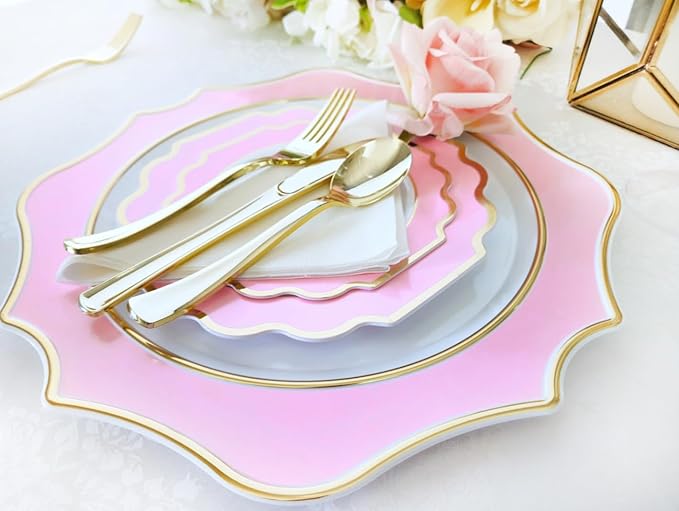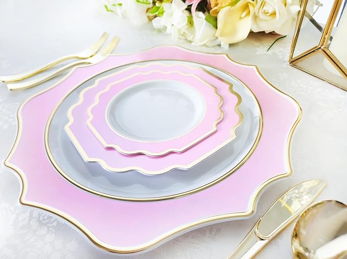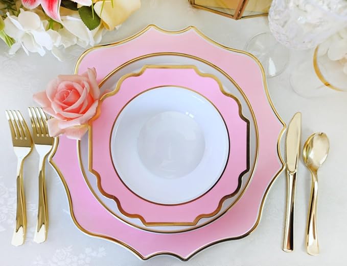 " OCCASIONS " 80 Plates Pack,(40 Guests) Heavyweight Premium Wedding Party Disposable Plastic Plates Set -40 x 10.5'' Dinner + 40 x 8'' Salad/Dessert(Imperial in Light Pink & Gold)