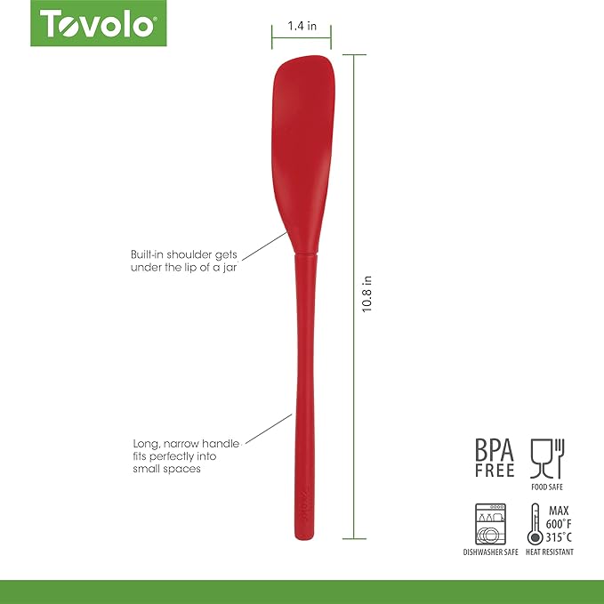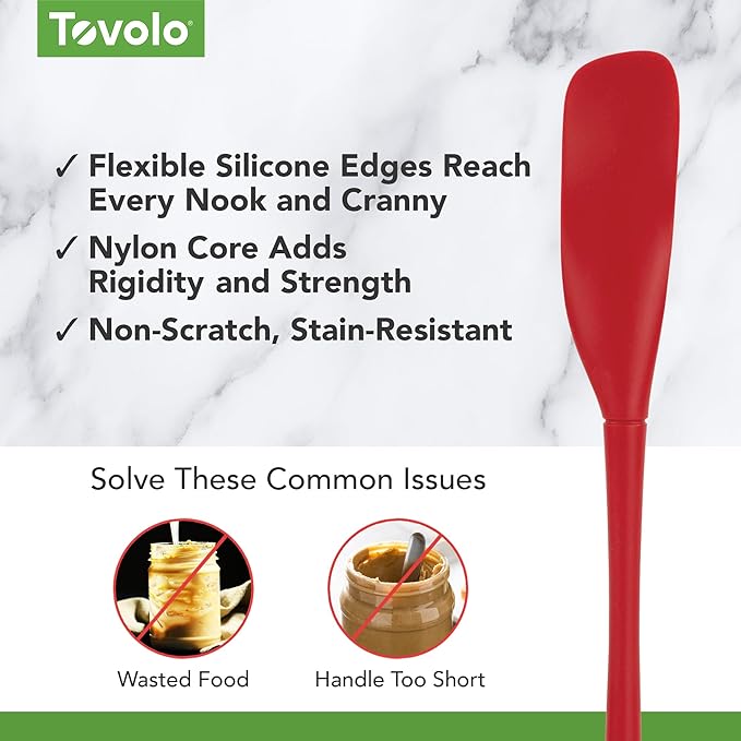 Tovolo Flex-Core All-Silicone Long-Handled Jar Scraper Spatula, Angled Turner Head, Kitchen Tool With Flat Back & Curved Front for Scooping & Scraping, Cayenne