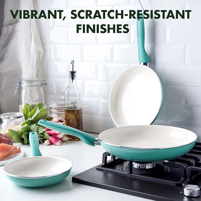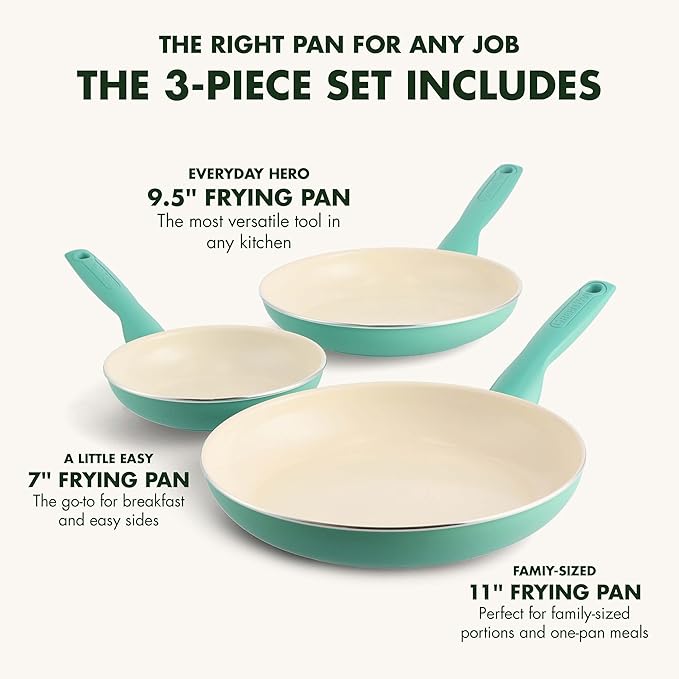 About This Set includes: 7", 9.5" , and 11" frypans GreenPan’s Thermolon healthy ceramic nonstick coating is free of PFAS,... Read more