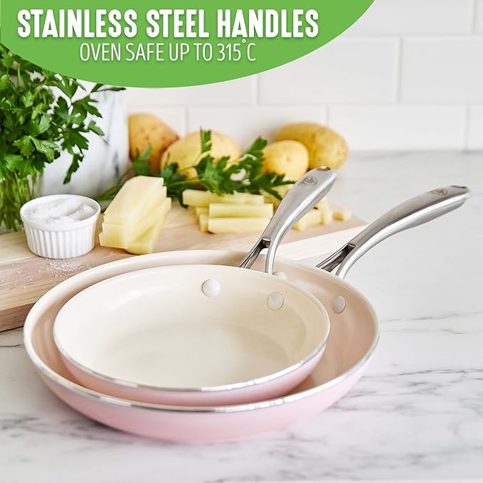 GreenLife Artisan Healthy Ceramic Nonstick, 8" and 10" Frying Pan Skillet Set, Stainless Steel Handle, Induction, PFAS-Free, Dishwasher Safe, Oven Safe, Pink