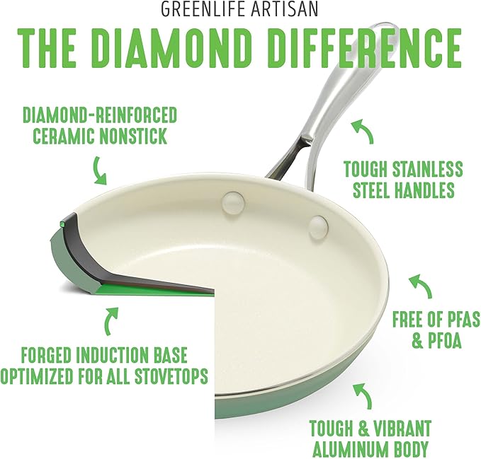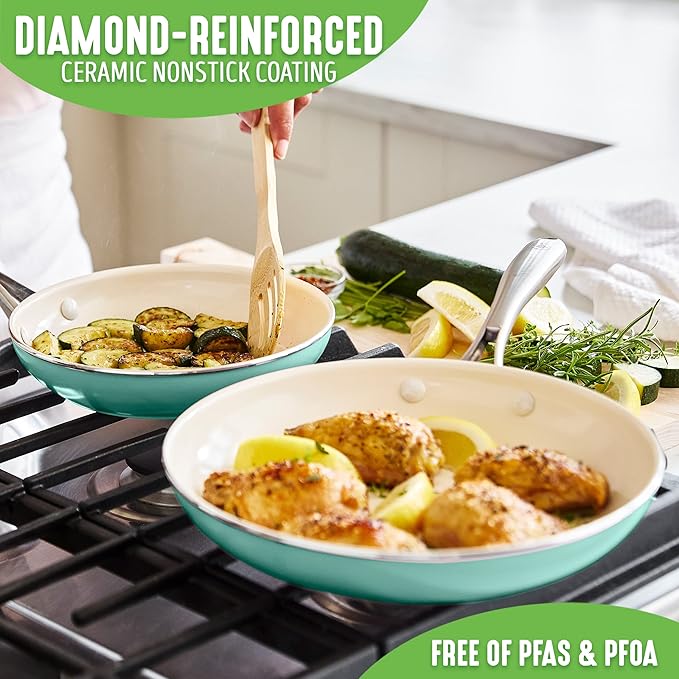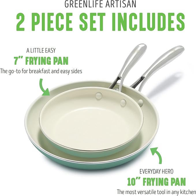 GreenLife Artisan Healthy Ceramic Nonstick, 8" and 10" Frying Pan Skillet Set, Stainless Steel Handle, Induction, PFAS-Free, Dishwasher Safe, Oven Safe, Turquoise