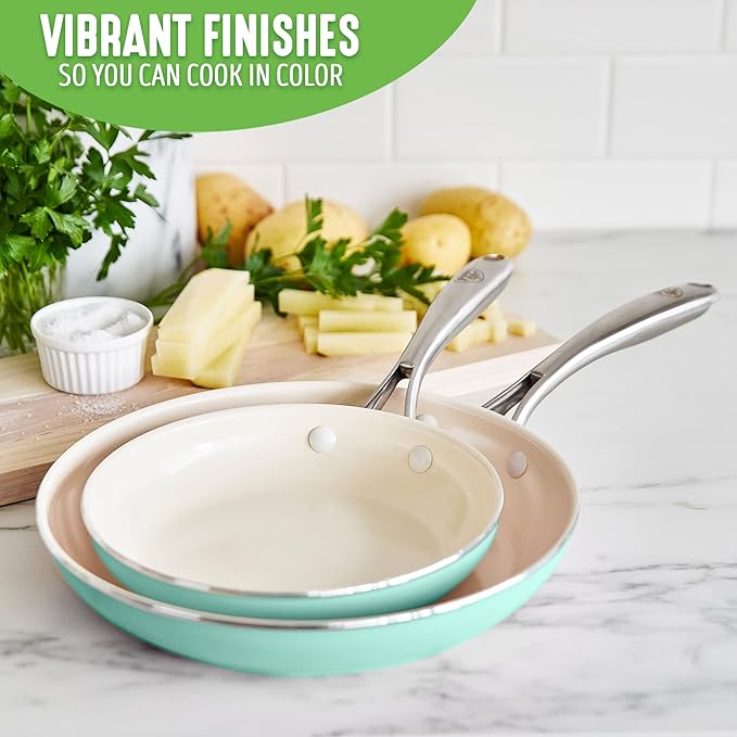About This Set includes: 8" frying pan and 10" frying pan Our healthy and easy-to-clean ceramic nonstick coating is derived... Read more
