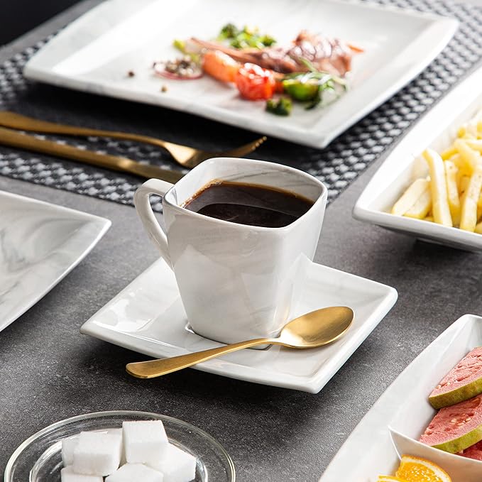 MALACASA Dinnerware Sets, 32 Pieces Porcelain Plates and Bowls Sets for 6, Marble Grey Dishes with Plates and Bowls, Cups and Saucers, Side Dish Plates, Square Dinner Set, Series Blance
