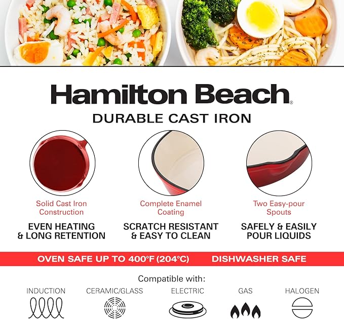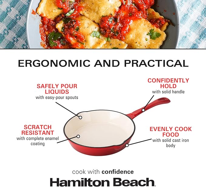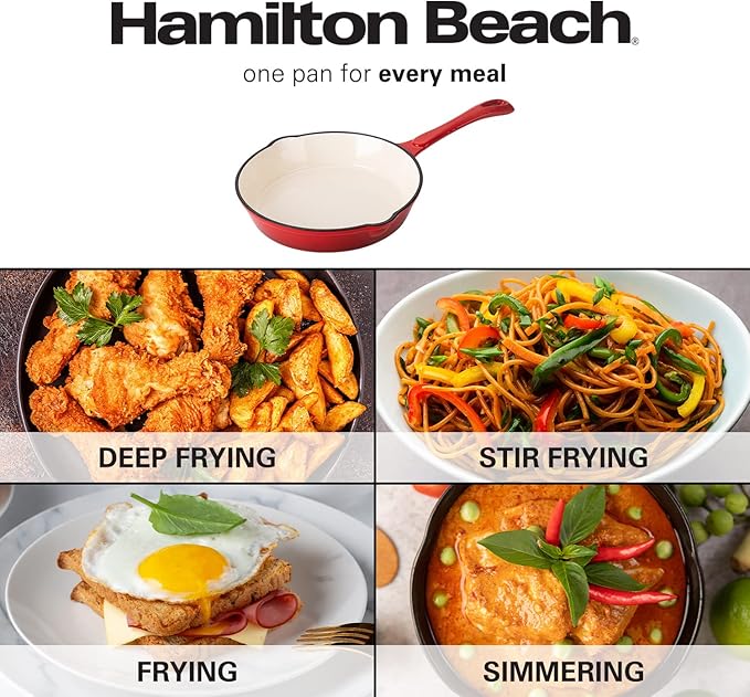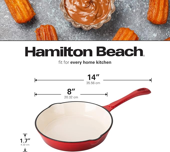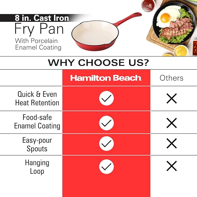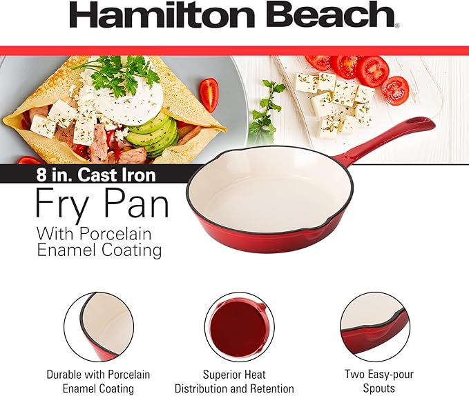 Hamilton Beach Enameled Cast Iron Fry Pan 8-Inch Red, Cream Enamel coating, Skillet Pan For Stove top and Oven, Even Heat Distribution, Safe Up to 400 Degrees, Durable