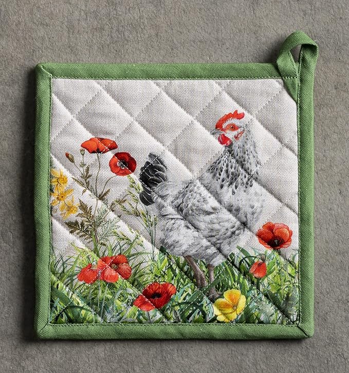 Maison d' Hermine Pot Holders 100% Cotton Heat Resistant Potholders 8" x 8" Hot Pads with Loop BBQ, Cooking, Baking, Grilling, Kitchen, Handling Hot Pans Spring/Summer (Pack of 1, Basse Cour)
