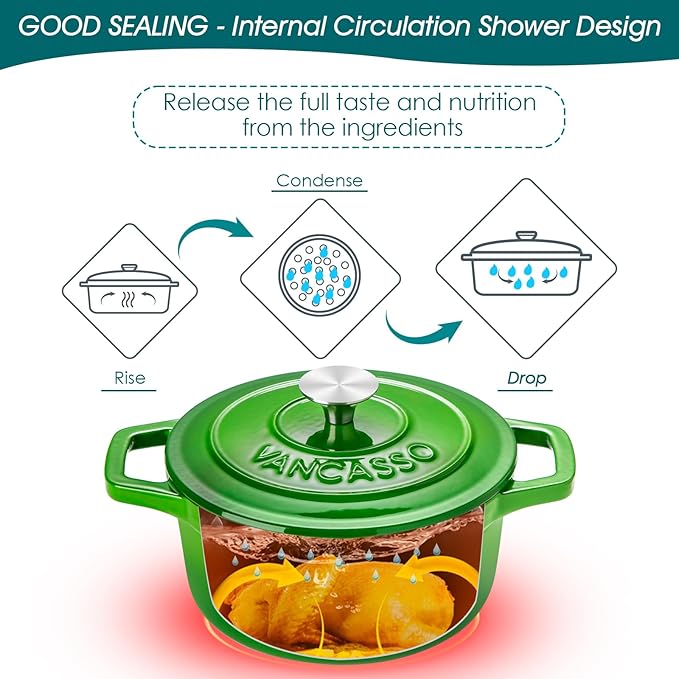 vancasso Enameled Cast Iron Dutch Oven, 2.5 QT Green Naturally Non-Stick Casserole Dish Cookware, with Stainless Steel Knob Lid Cast Iron Casserole for Steam Braise Bake Broil Saute Simmer Roast