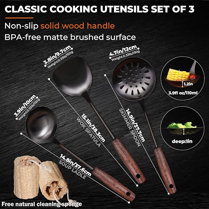 Wok Spatula and Ladle,Skimmer Ladle Tool Set,15 Inches 18/10 Stainless Steel Vintage Wok Utensils,Wok Spatula and Ladle Set with Solid Wooden Handle,Wok Accessories with Natural Cleaning Loofah Sponge