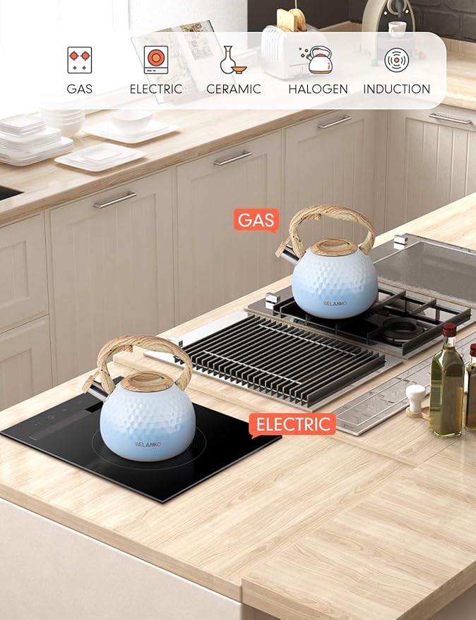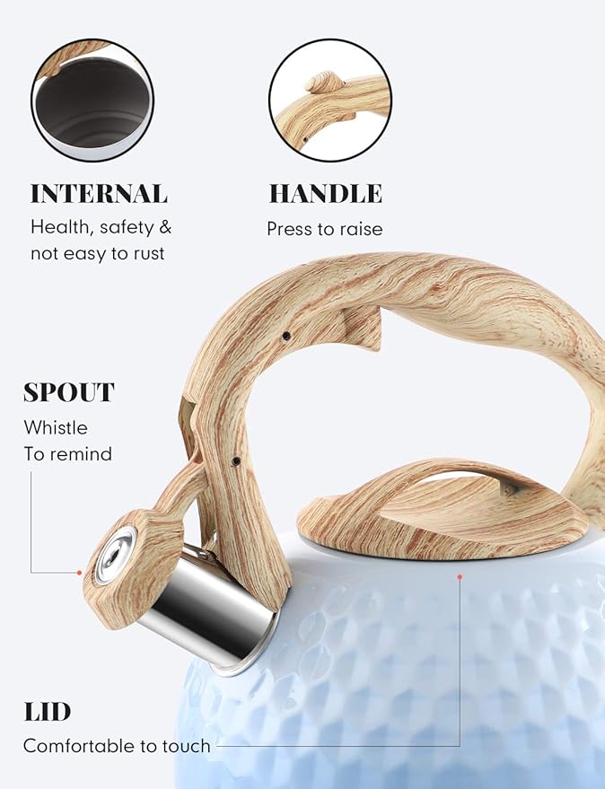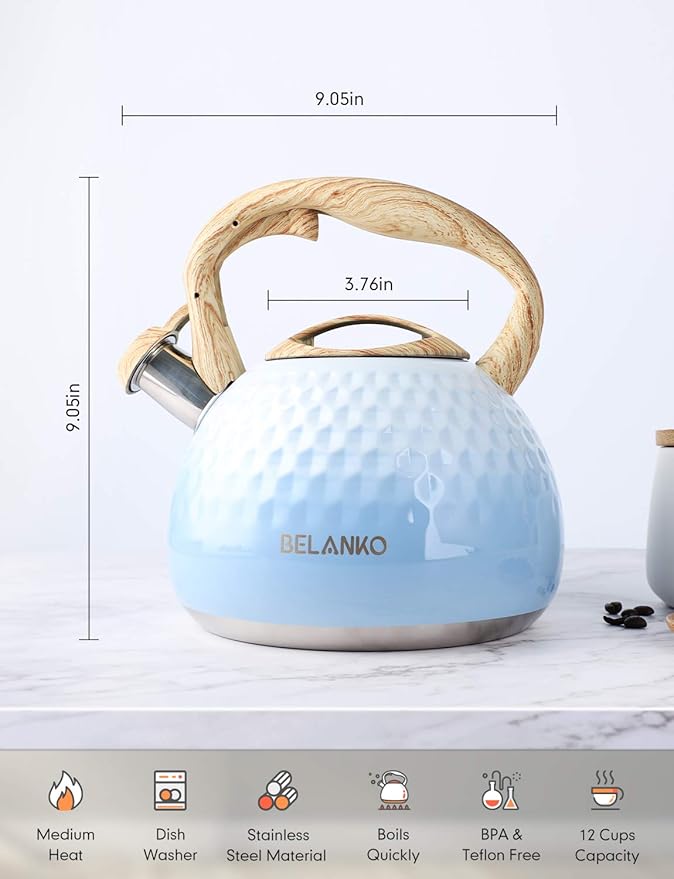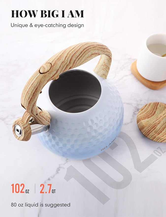 BELANKO 2.7 Quart Tea Kettle for Stovetop - Food Grade Stainless Steel with Diamond Texture, Designer Teapot Look, Cool-Touch Wood Pattern Handle, Whistling Spout - Gradient Blue
