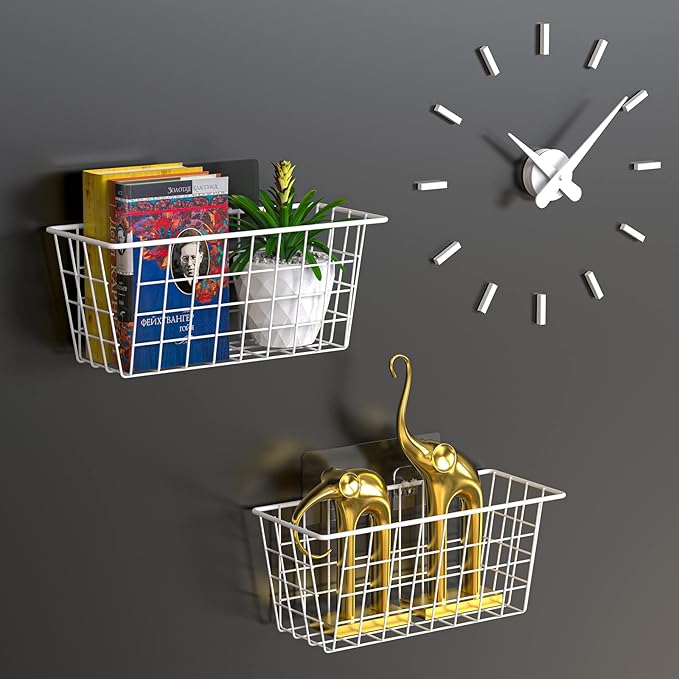 MaraFansie Wall Wire Baskets Bin No Drilling Adhesive Hanging Baskets Wall Mounted for Cabinet & Pantry Organization and Kitchen, Bathroom, Bedroom Storage, 2 Pack, White