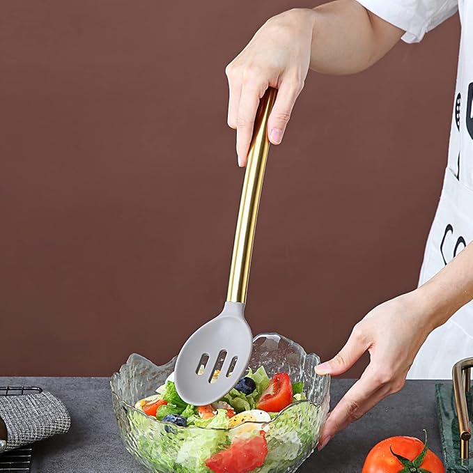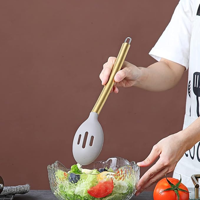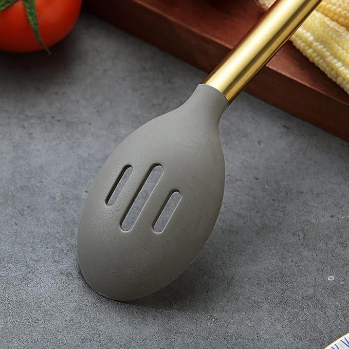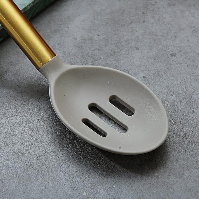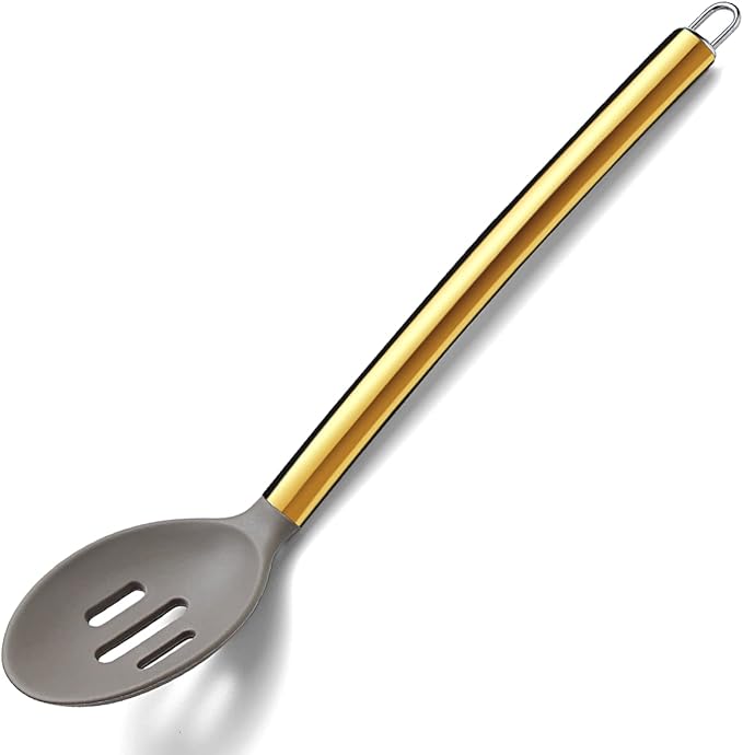 Berglander Non-stick Silicone Slotted Spoon, Titanium Gold Plated Handle, Basting Spoon, Dishwasher Safe, Easy to Clean