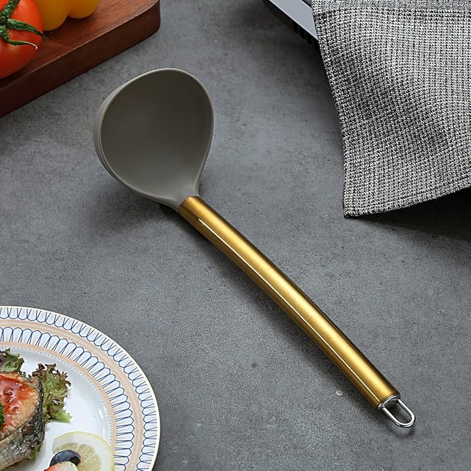 Gold Ladle, Berglander Non-stick Silicone Kitchen Ladle With Titainium Gold Plating handle, Soup Ladle, Cooking Ladle Soup Spoon For Cooking, Dishwasher Safe, Easy to Clean