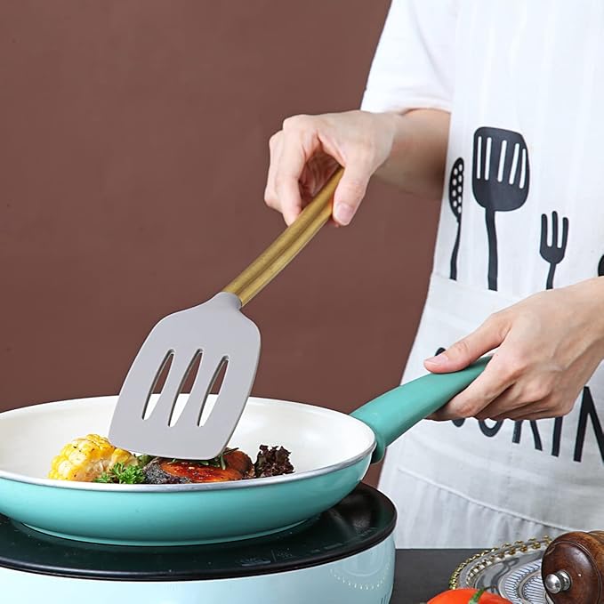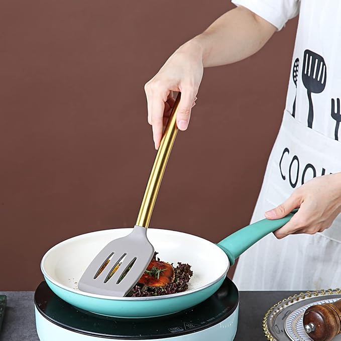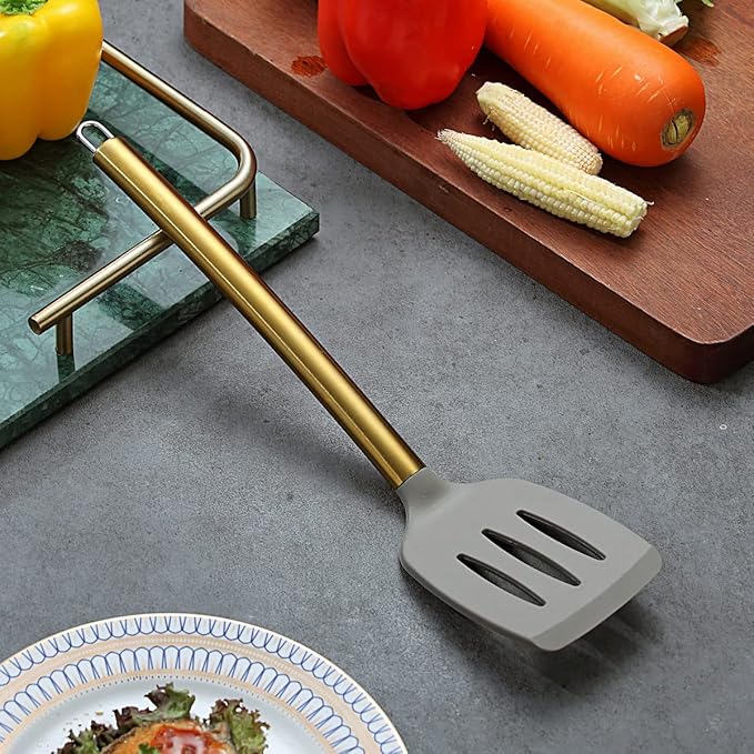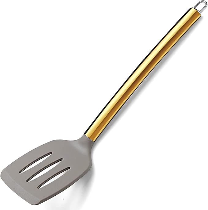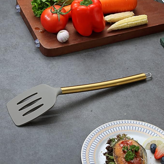 Berglander Non-stick Silicone Slotted Turner with Titanium Gold Plated Handle for Cooking, Dishwasher Safe, Easy to Clean