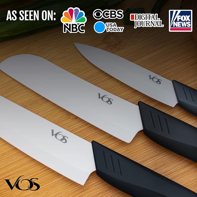 Vos Ceramic Knife Set in Elegant Gift Box, Ceramic Knives Set For Kitchen, Ultra Sharp Kitchen Knife Set with Covers, 4" 5" 6" Paring, Santoku & Chef Knife, Lightweight, Dishwasher safe (Black Handle)