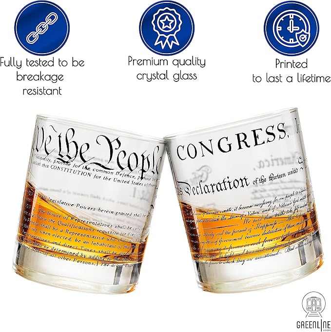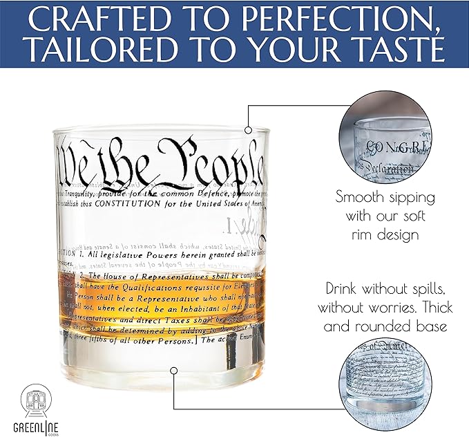 Greenline Goods Whiskey Glasses – United States Constitution + Declaration Glass (Set of 2) - 10 oz Tumblers - American US Patriotic Gift Set - Old Fashioned We The People Cocktail Glasses