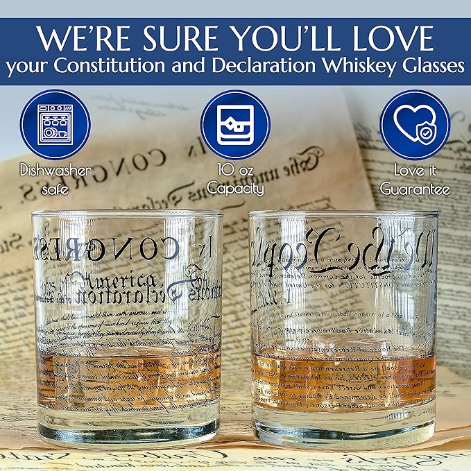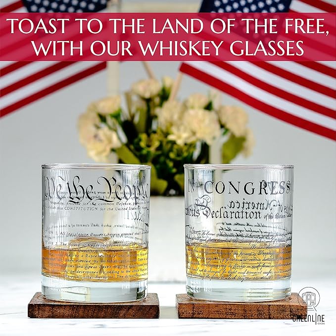 About This Patriotism personified - One whiskey glass reflects the unmistakable United States Constitution and the other reflects the declaration... Read more